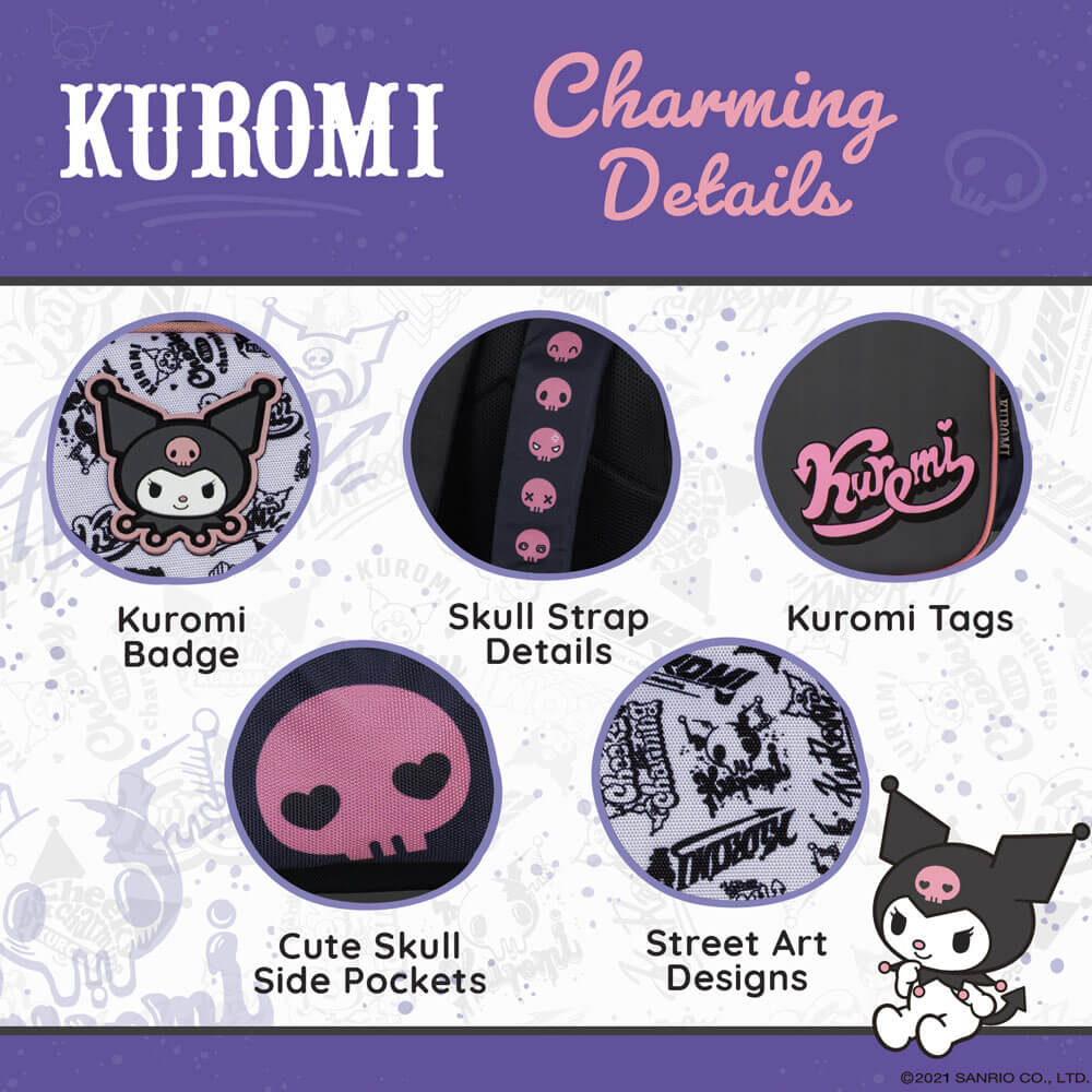 KUROMI BACKPACK Hit the books in style with these exclusive Sanrio backpacks that bring your beloved characters along for every lesson and adventure. Each bag features charming details and generous compartments perfect for stashing lunch, textbooks, ipad, water bottles, and all your essentials. Stand out from the crowd with a...